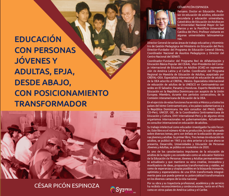 Imaginen un tipo de educación que no viene "de arriba hacia abajo", sino que se construye junto con las comunidades, escuchando lo que la gente realmente necesita aprender. Eso es exactamente lo que propone el Dr. César Picón Espinoza en su libro "Educación con Personas Jóvenes y Adultas, EPJA, desde abajo, con posicionamiento transformador" (2025, 306 páginas), recogiendo más de 60 años de experiencia en el campo.