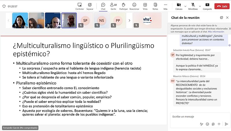 Durante la sesión, el representante de la Dirección General de Educación Extraescolar (DIGEEX) de Guatemala, invitado a ser uno de los expositores del tema, intervino abordando la importancia de la multiculturalidad, interculturalidad y bilingüismo en los procesos formativos de la EPJA. Partiendo de la premisa de que Guatemala es un país multiétnico, multicultural y multilingüe - con 25 idiomas reconocidos incluyendo 22 lenguas mayas, xinka, garífuna y español – hizo referencia a leyes relativas a la interculturalidad y al reconocimiento oficial de los 25 idiomas en la legislación del país, y enfatizó la necesidad de desarrollar programas territoriales que respondan a esta diversidad.