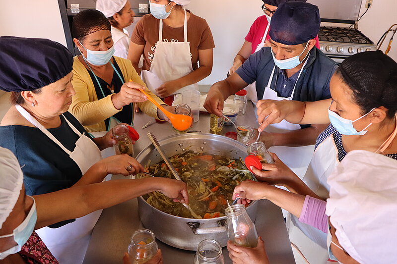 “Esto nos sirve para entender mejor el trabajo de la maestra, para desestresarnos un rato y para convivir”, comenta tallerista de tecnología de alimentos, al mismo tiempo que menea los chiles en escabeche que se están cociendo en la estufa.