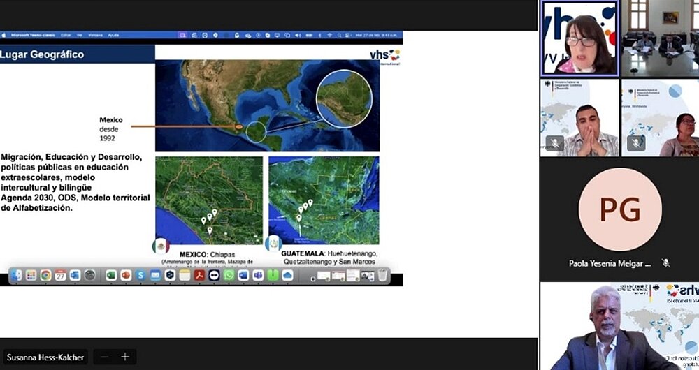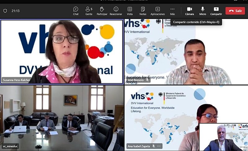 Llevamos a cabo una reunión virtual con el Viceministerio de Educación Extraescolar y Alternativa de Guatemala, representado por Edin López, asesores del viceministro y la directora general de Educación Extraescolar (DIGEEX); y por parte de DVV International Centroamérica, México y El Caribe, participaron su directora regional Susanna Hess-Kalcher, y los coordinadores de proyectos país Guatemala y México.