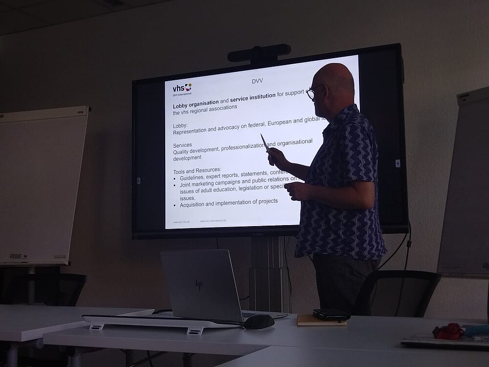 Durante el evento, se presentaron las particularidades y enfoques de trabajo de cada región, los contextos específicos de cada país y los desafíos que enfrenta DVV International en la promoción de la Educación de Adultos (ALE) y la Educación para Jóvenes y Adultos (EPJA) en ambos continentes. Además, se discutió el posicionamiento global de la organización y su experiencia de 75 años en el campo, destacando los documentos y recursos de apoyo disponibles para la guía de procesos.