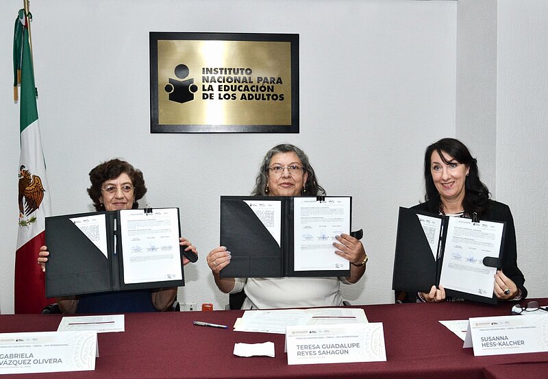 El pasado 18 de julio, firmamos un convenio de colaboración con el Centro de Cooperación Regional para la Educación de Adultos en América Latina y el Caribe (CREFAL) y el Instituto Nacional para la Educación de los a Adultos (INEA), con el objetivo de desarrollar ofertas educativas para formadores de personas jóvenes y adultas hablantes de lenguas indígenas.