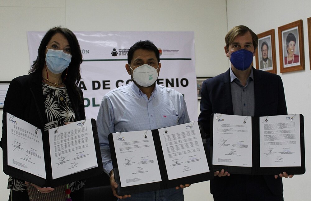 Durante el evento de firma de convenio, los directivos de ambas instituciones: Gustavo Gómez Ordóñez, Director General del ICHEJA, Chistoph Jost, Director General de DVV International y Susanna…